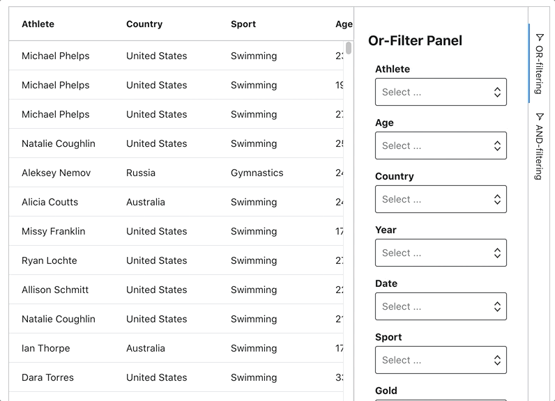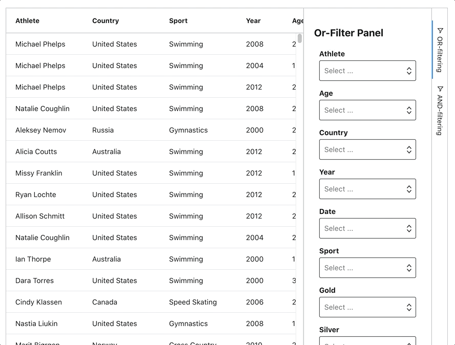 The OR-filtering tool panel will apply OR-Filtering conditions to the data and bind the result to the AG Grid row data property. The AND-filtering tool panel will then apply AND-Filtering conditions to AG Grid row data, displaying the matching records in the grid.