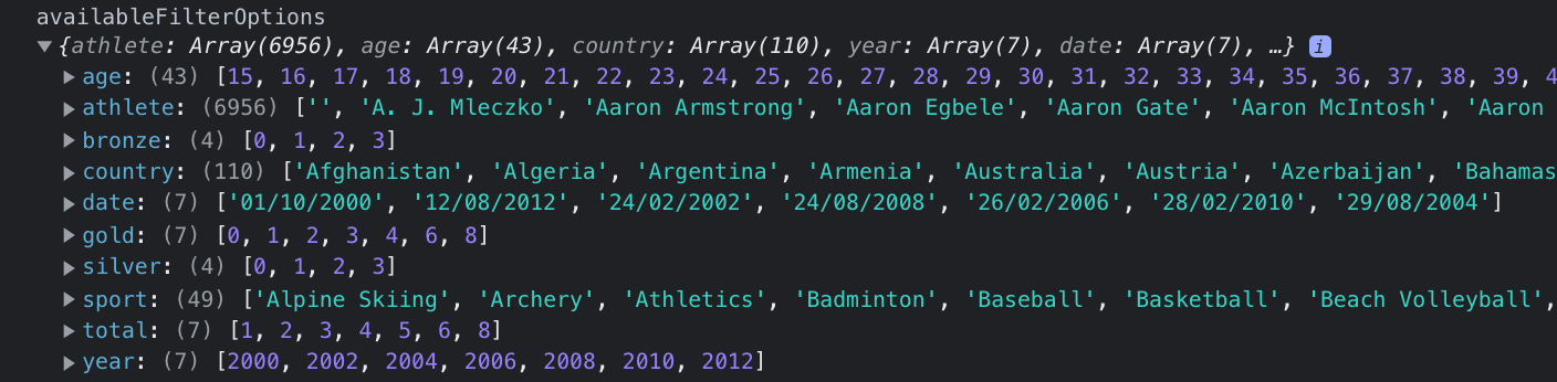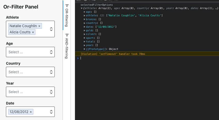 We keep track of the selected dropdown options in the state variable selectedFilterOptions. This state variable contains the filtering conditions to be used in the OR-filtering algorithm. In the screenshot below, the selection in the panel on the left is represented by the state variable value on the right.