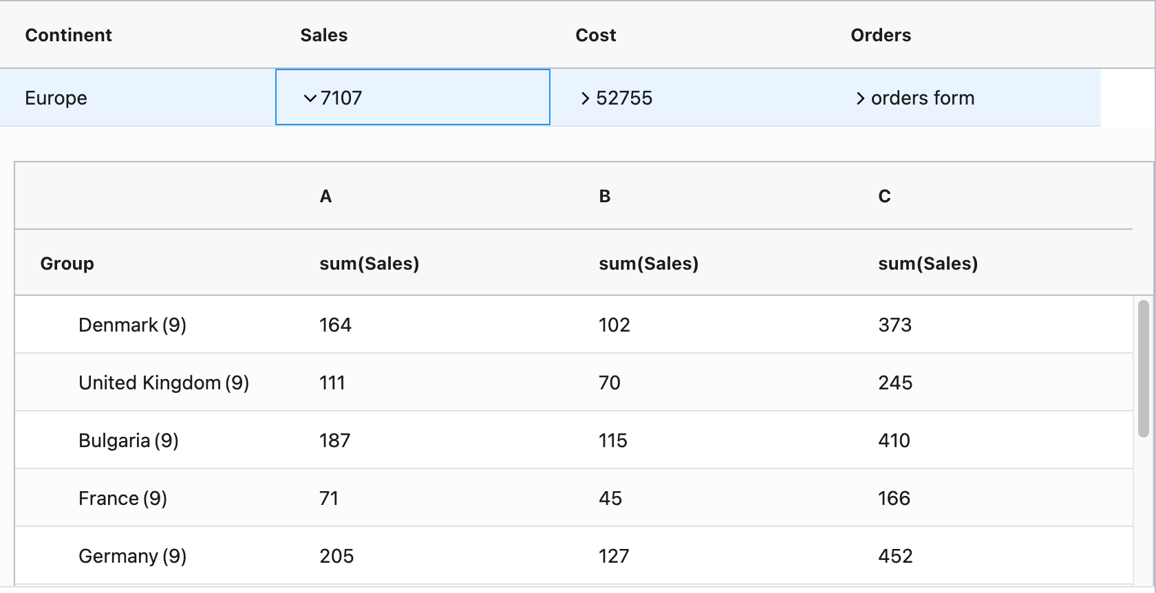 When expanding the Orders column of a master-level row, the detail content shows a data entry form. We can use this form to add records to update the sales and cost details and the values in our master row.