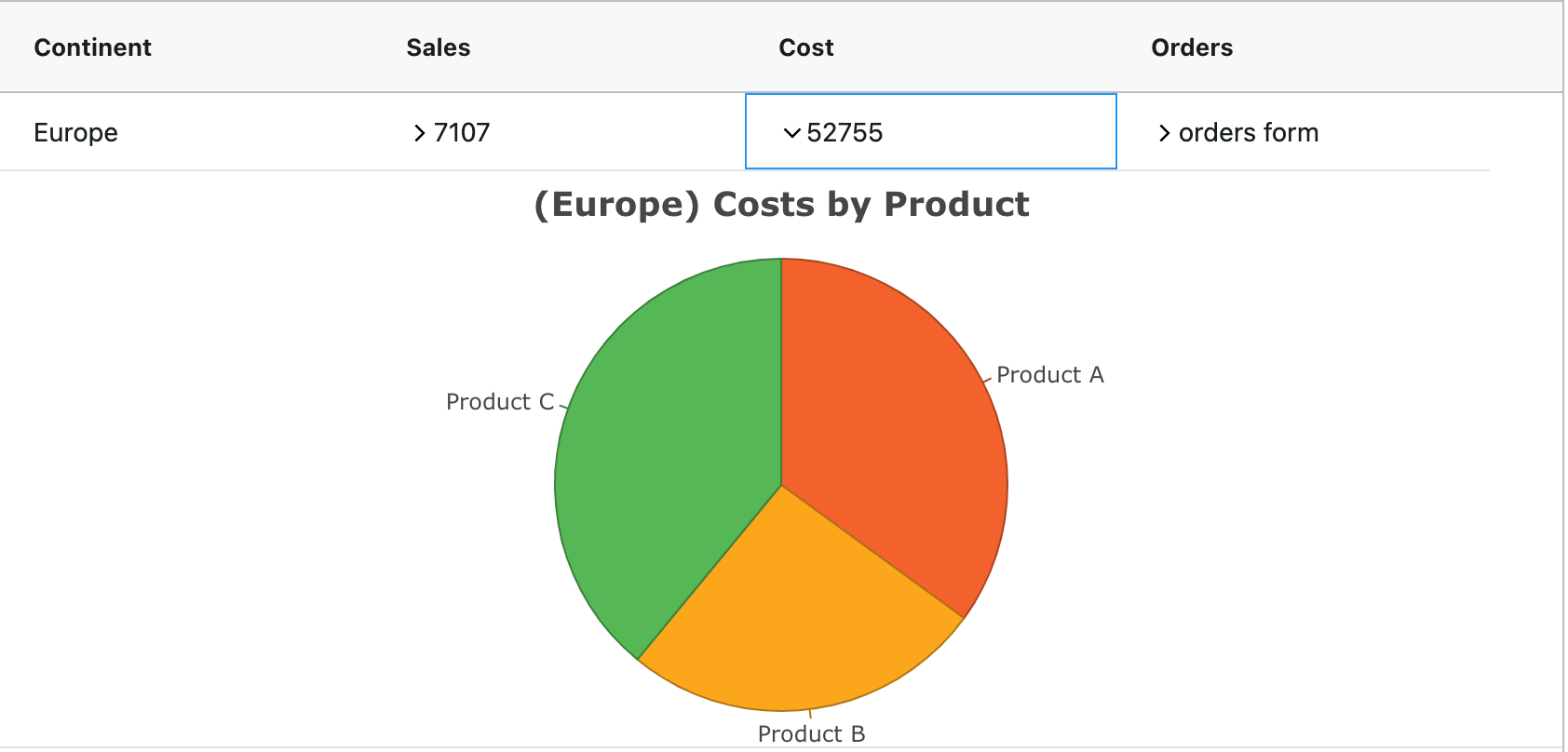 When expanding the Cost column of a master-level row, we display a pie chart showing the total cost of each product in the grid detail under sales. We use the context object here in a similar way to the Sales detail to display the latest data if a user has added a record using the Cost detail as shown below: