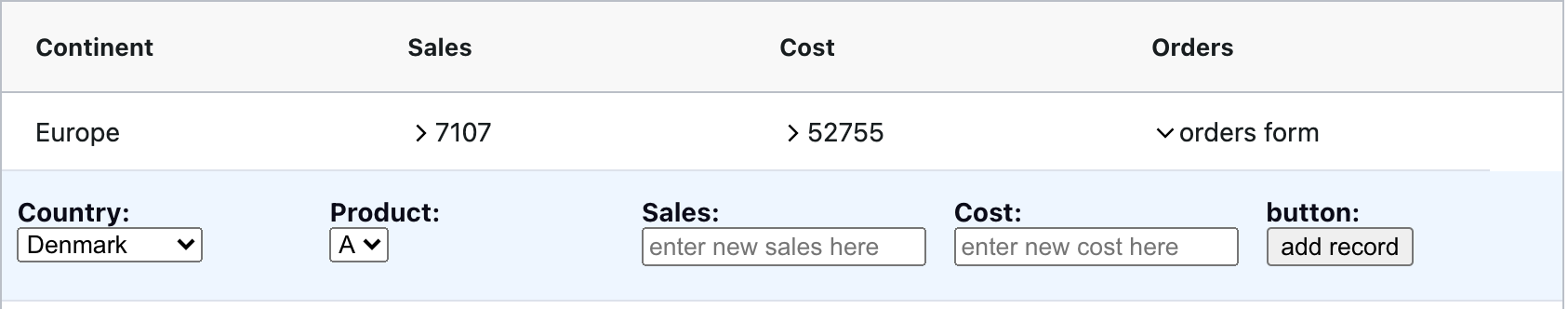 The order form consists of two drop down menus, two text inputs and a button. The first drop down contains the countries listed in the sales detail, the second contains products A, B and C. The text inputs allow the user to enter the sales and the cost of this product and the button adds the record as shown below: