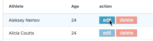 We now have the Edit and Delete buttons rendering inside the action column but they don't automatically change to the Update and Cancel buttons when a user starts editing a particular row. This is because ag-Grid doesn't automatically refresh the cellRenderers when editing starts or stops.