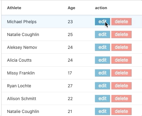 Notice that we don't add any event listeners to the buttons in our custom cellRenderer. This is because if you have a large number of rows it may cause a performance hit due to all the event listeners being created and destroyed when scrolling.
