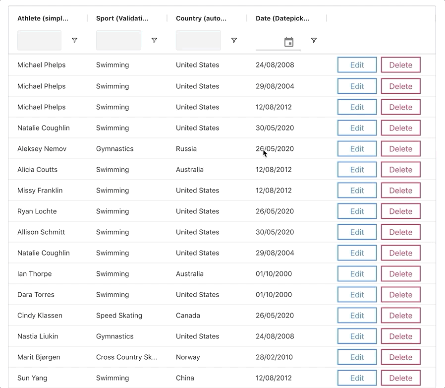 ag-Grid gives great flexibility in the ways you can update cell content. In this post, we'll demonstrate a simple CRUD application written using React Hooks. We'll go over some frequently used configurations in custom editors and show you how to create and destroy rows using custom renderers. We'll also upgrade the ag-Grid default date filtering behaviour by integrating a third party Date Picker component.