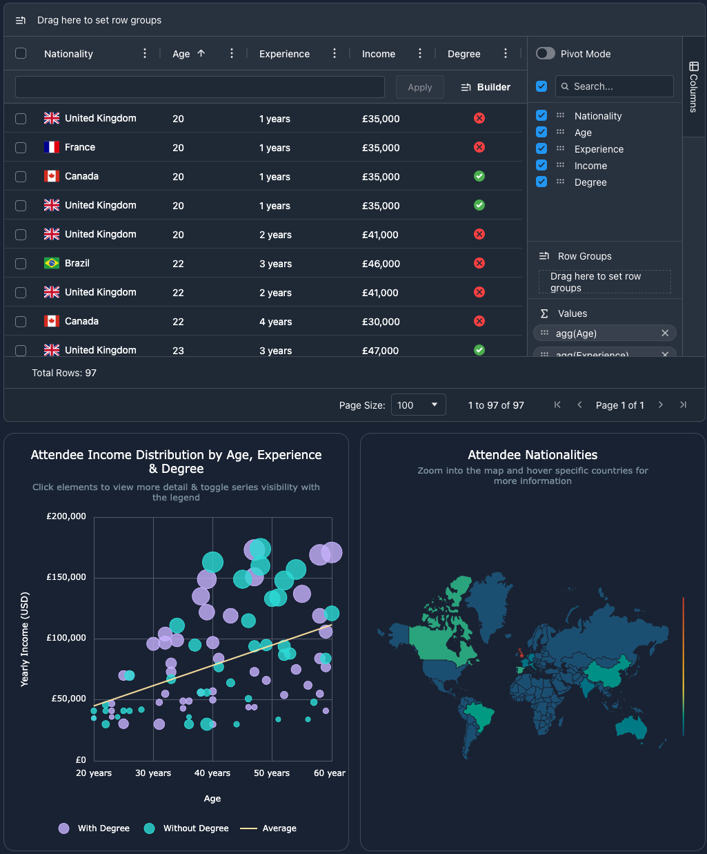 The booth also featured interactive demos of AG Grid and AG Charts, including the example below which allowed attendees to see how our grid & chart libraries work seamlessly together: