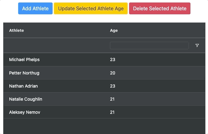 - Select an athlete with age=20 from the grid and click on the Update Selected Athlete Age button to update the age. The selected athlete will have its age incremented by 1 to now be 21.