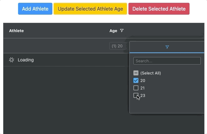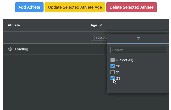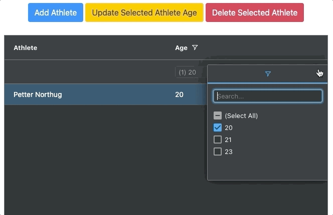 - Select that row and click the button Delete Selected Athlete. This will delete the row from the grid and since it was the only row in the grid with Age value of 20, the value 20 will be removed from the Set Filter items. Thi way the filter will only show 21 and 23 - the only Age values present in the grid)