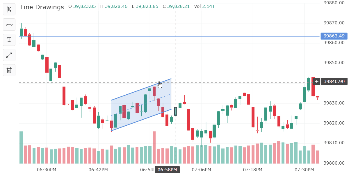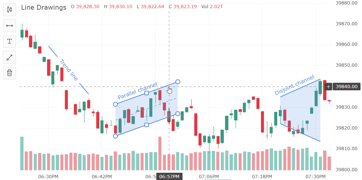 Users can add labels to trend lines and channels. These allows clearly communicating the meaning and significance of the annotations for later reference. These labels can be styled, edited and positioned from the settings dialog, so that they are more readable and discoverable.