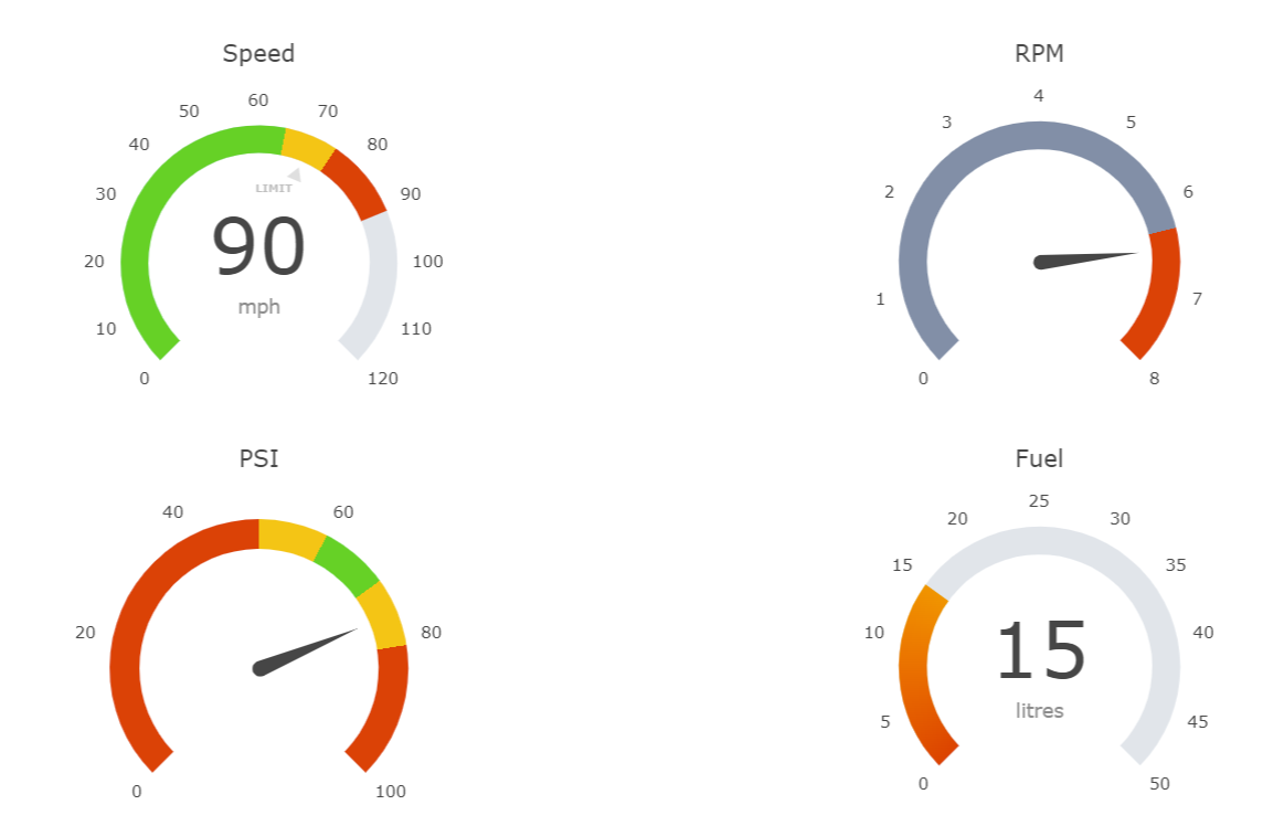 The Radial Gauge presents a single data point within a predefined range along a circular scale. The data is represented by a needle or bar indicating the value and can be shown alongside contextual values or targets.