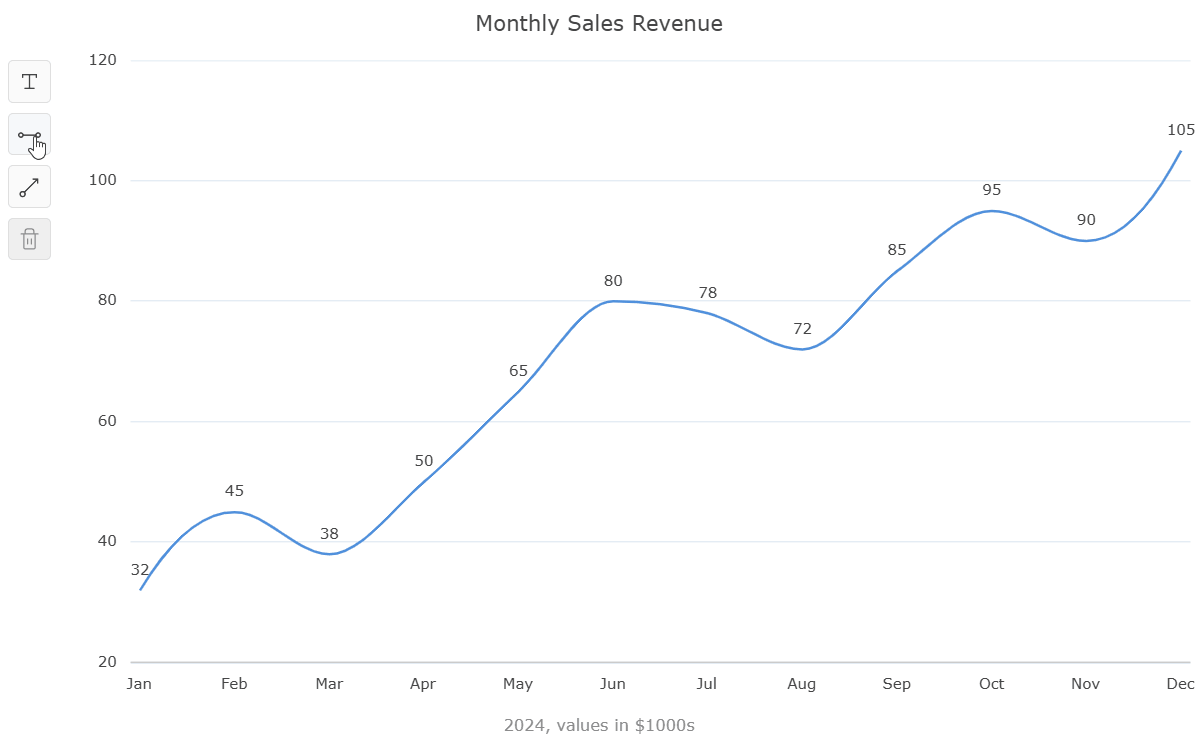 Users can now add Annotations to any cartesian chart. Originally only available on Financial Charts, this functionality is now available across all cartesian charts. Users can add and manage trendlines, text annotations and arrows from the customisable toolbar.