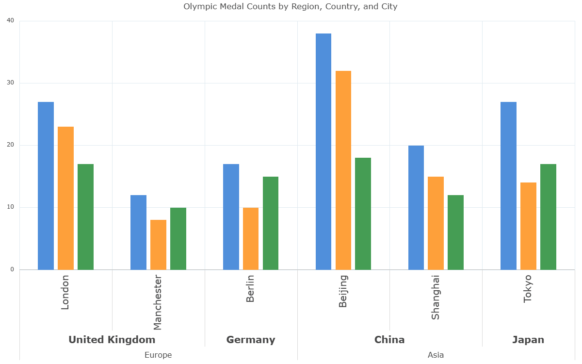The Grouped Category Axis displays hierarchical axis levels for better organization and visualization of grouped data. Each level can be customised and configured with distinct formatting and labels.