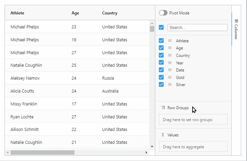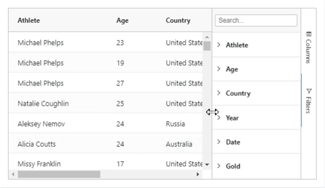 Users can now resize the different panels inside the column tool panel. This will make it easier to use many columns in the row groups, columns and values panels.