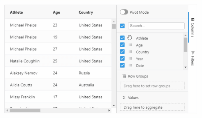 Users can now drag and drop items in the columns tool panel to reorder the columns in the grid as standard functionality. This is especially useful when you have a long list of columns and dragging columns across the grid isn't practical. See this demonstrated below: