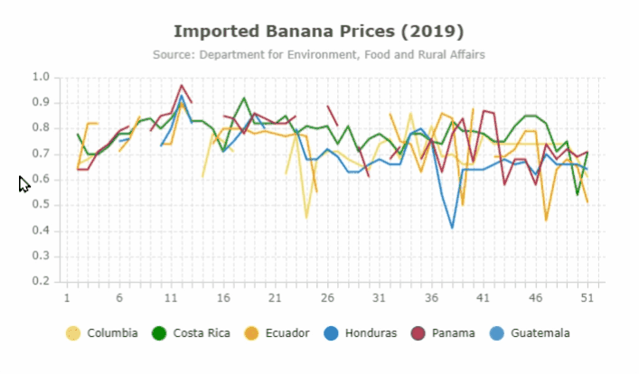 When using the standalone chart you may have multiple series which are displayed quite close together and are difficult to distinguish. In order to help you more easily tell series apart, in AG Grid 26.1, the standalone chart now offers chart series highlighting across all series types. When activated, hovering a series item will dim other series items, allowing you to clearly see the items of the hovered series, as shown below: