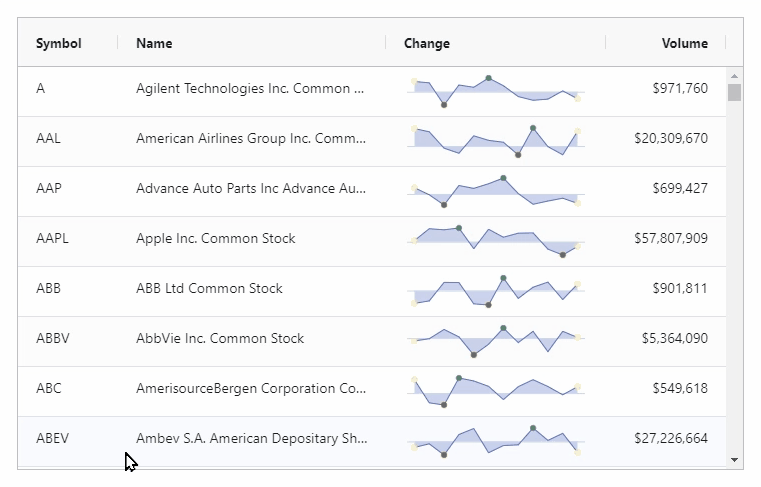 The sparkline functionality is tightly integrated in AG Grid which makes it easy to set up and keeps scrolling responsive as you scroll through rows and columns containing sparklines, as shown below: