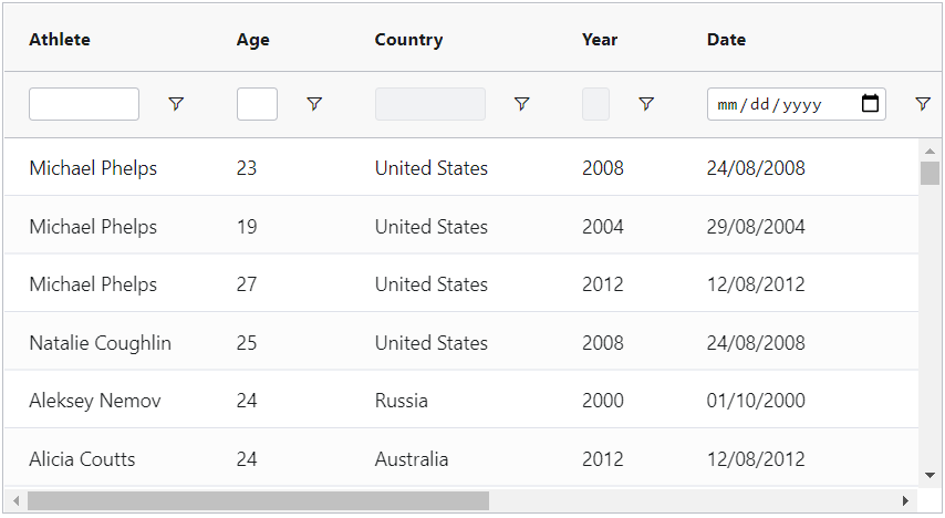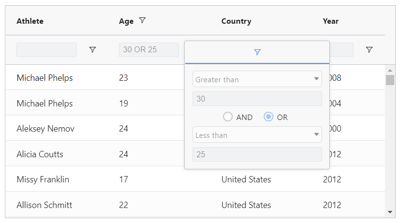 The user can now directly TAB through the floating filter inputs in AG Grid. This allows to quickly move from one column filter input to another and to configure filters with ease, as shown below: