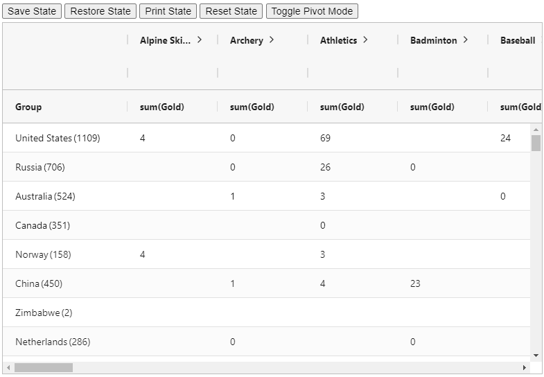 Starting with AG Grid 27.2 users can now save and restore secondary column state when pivoting. The saved column state includes secondary column width, order, sort direction, secondary column expanded/collapsed state, pinned state. This allows users to save specific pivot views and easily restore them later as described in our documentation and shown below: