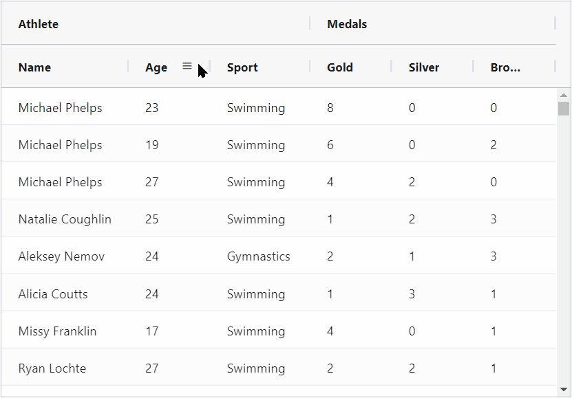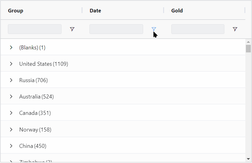 Also, when using row grouping or tree data, the user can see values from all the hierarchy levels at the same time and filter out an entire subtree of the dataset. This allows users to more quickly interact with hierarchical data and focus on the rows they're interested in.