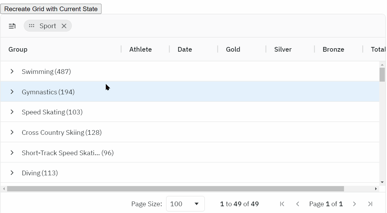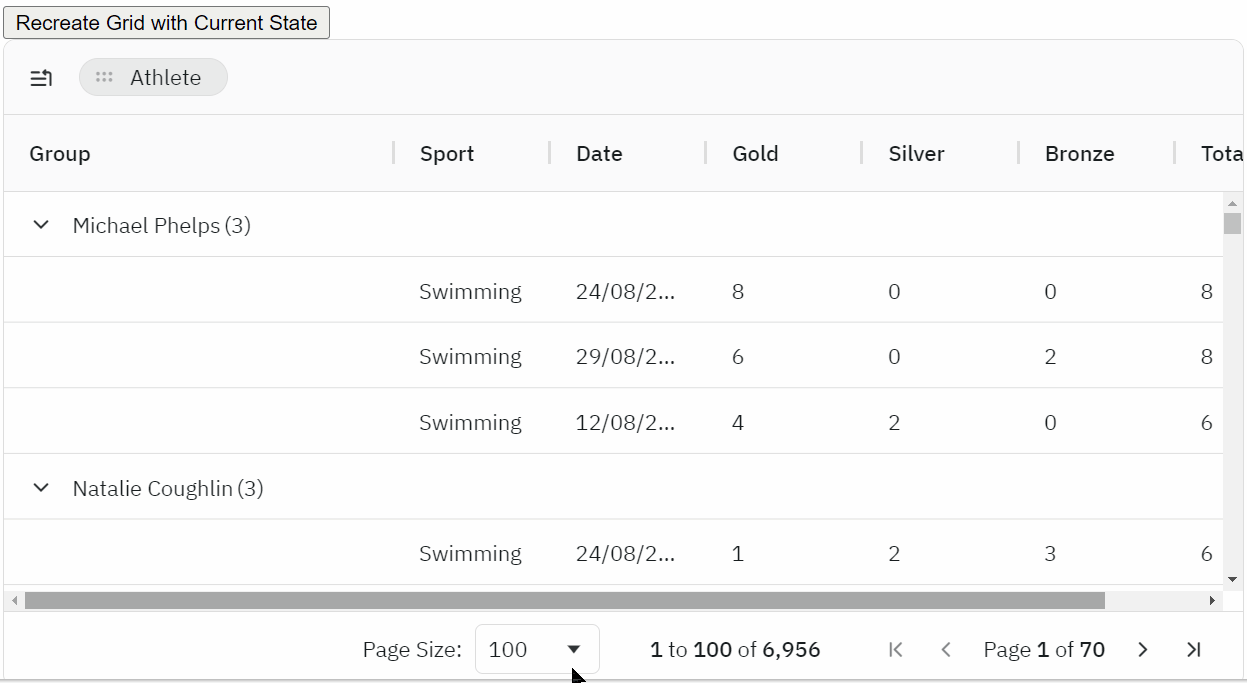 AG Grid now supports changing the page size directly via a page size selector which is displayed in the pagination panel when Row Pagination is enabled. The page size and current page index are saved by the grid state and can easily be restored as part of the initial state, as shown below. Learn more about this new feature here: